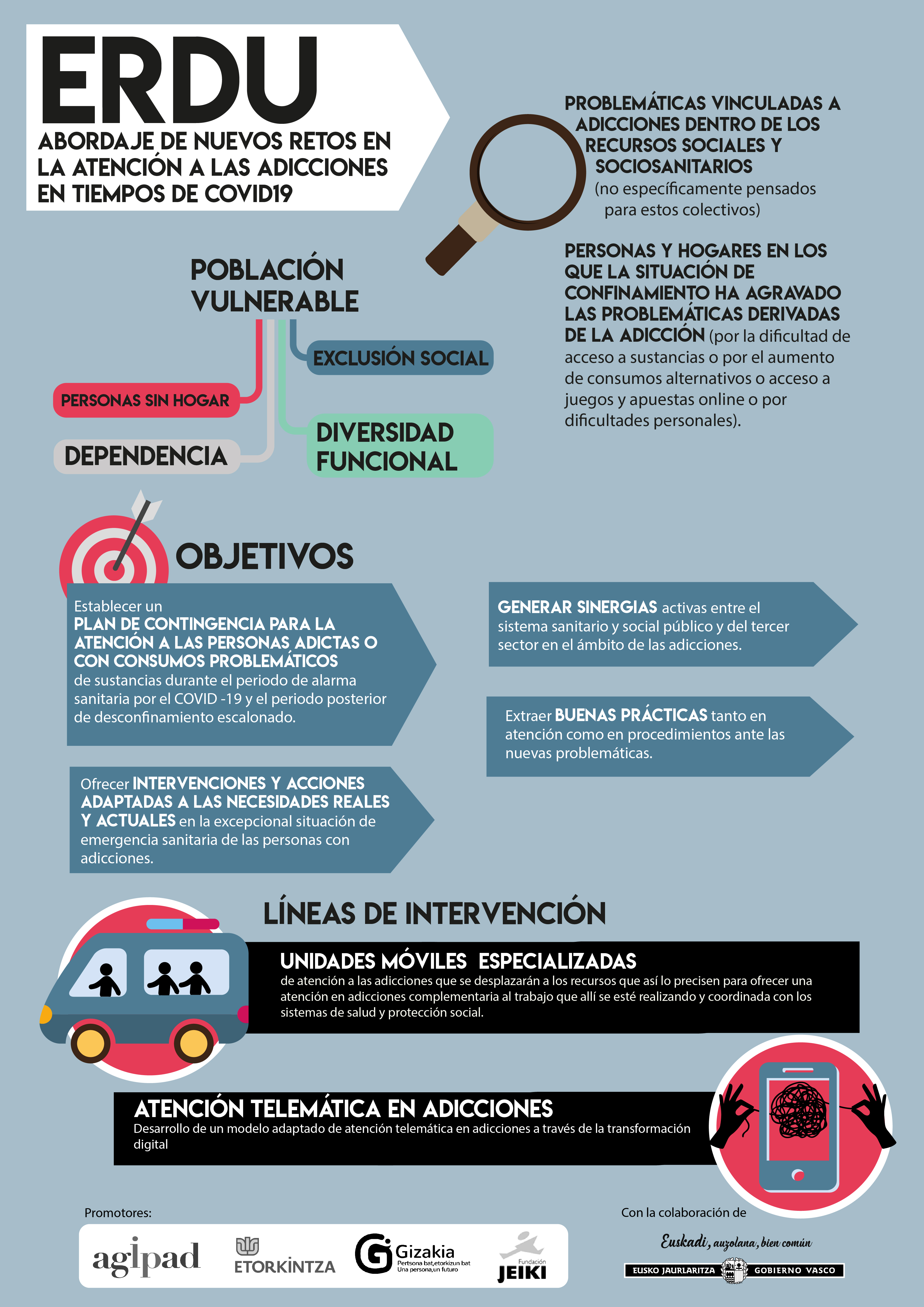 En mayo de 2020, el departamento de Empleo y Políticas Sociales del Gobierno vasco, dentro del Fondo “Inor atzean utzi gabe”, puso en marcha el programa Erdu-Intervención de Proximidad en Adicciones.